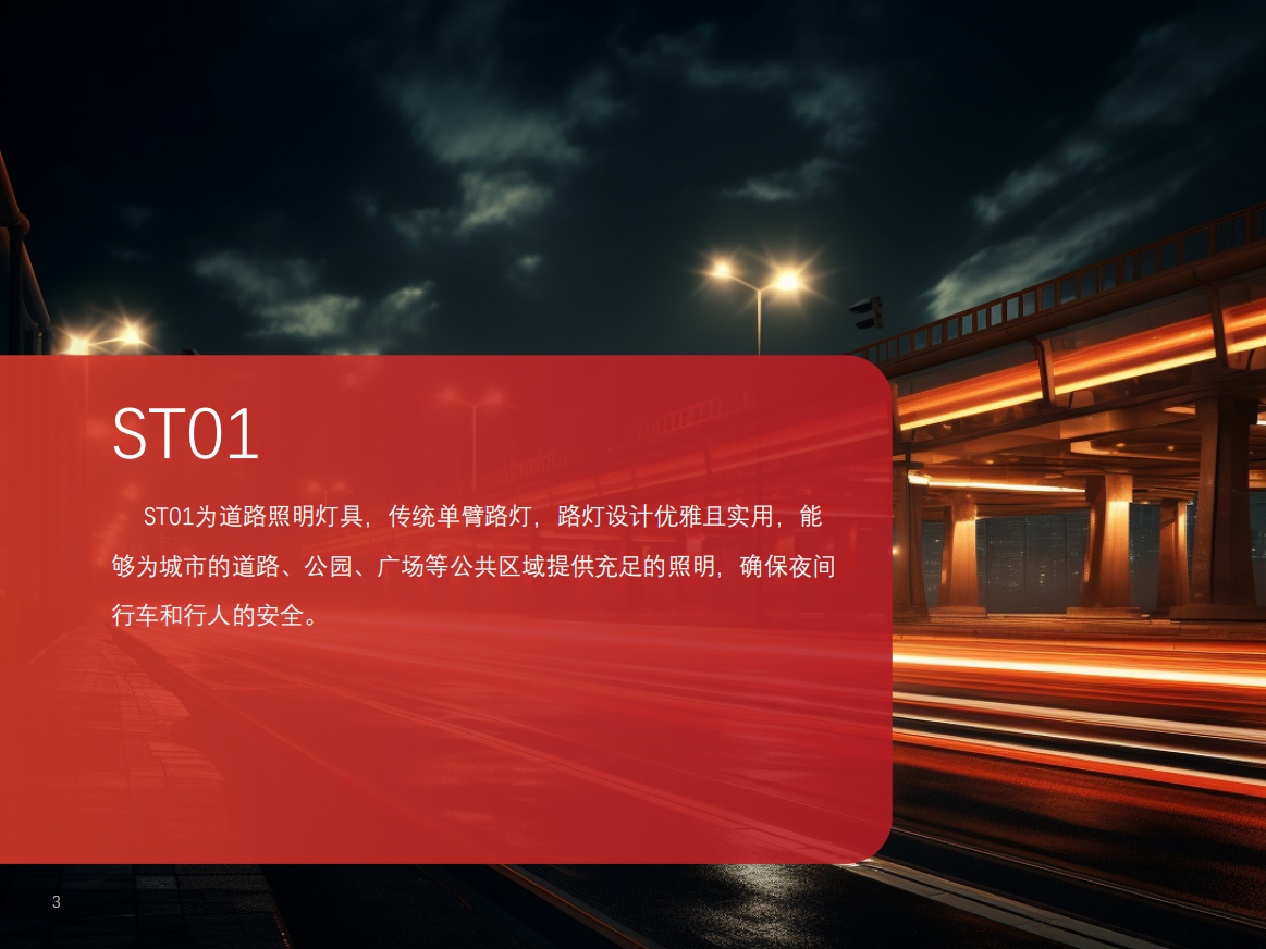 ST01为道路照明灯具,传统单臂路灯,路灯设计优雅且实用,能够为城市的道路、公园、广场等公共区域提供充足的照明,确保夜间行车和行人的安全。