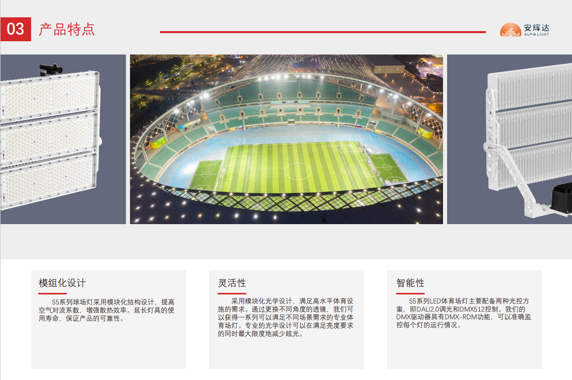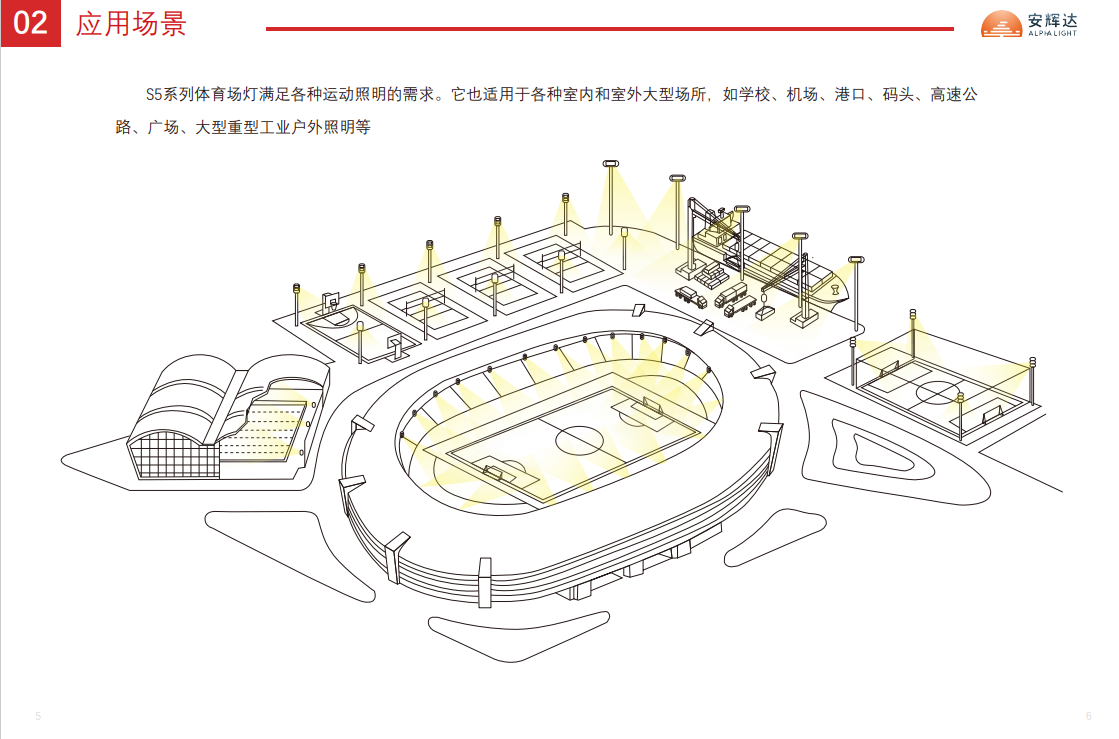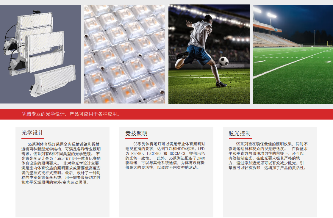S5 LED 球场灯旨在满足专业比赛的最高照明性能标准。S5 系列提供在水平和垂直方向上具有出色光分布的解决方案,确保裁判、球员和摄像机的完美可视性,并满足观众的最大视觉舒适度。