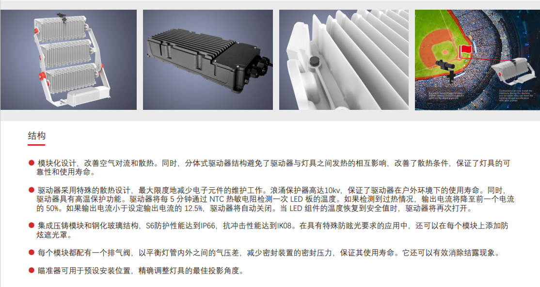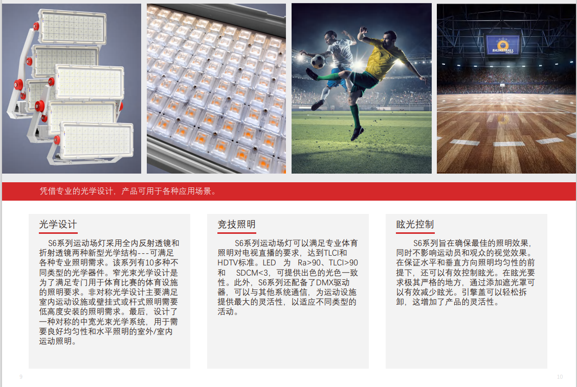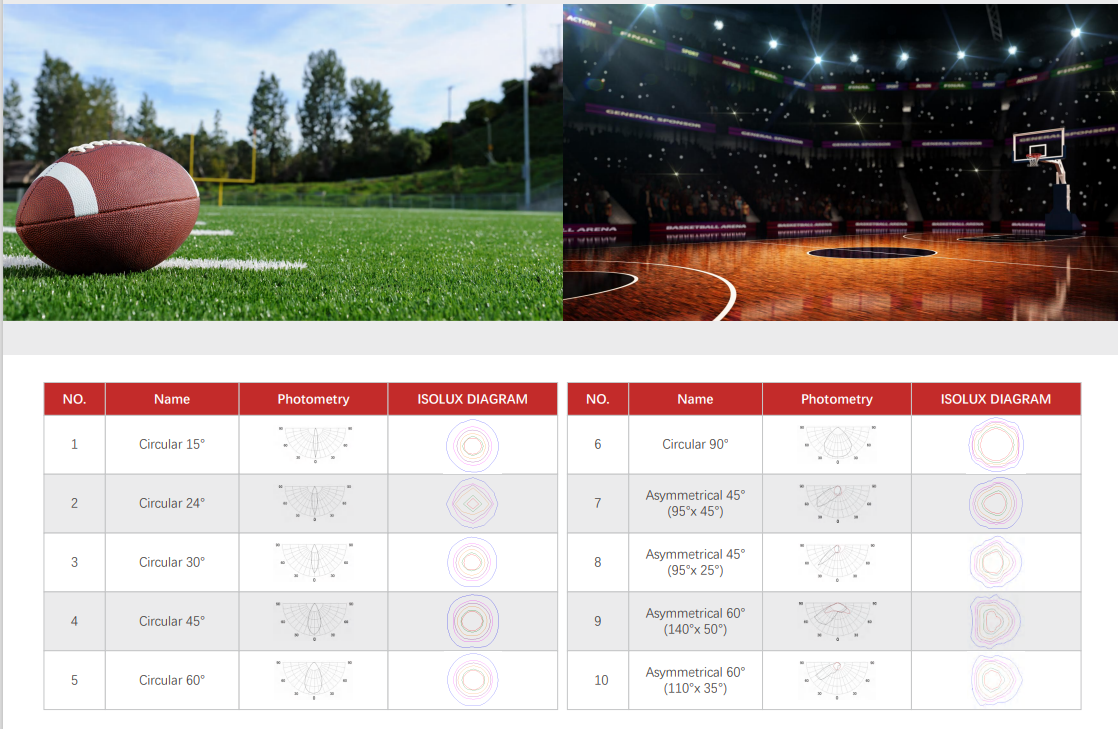 S5系列体育场灯采用全内反射透镜和折射透镜两种新型光学结构,可满足各种专业照明需求。该系列有6种不同类型的光学透镜。 窄光束光学设计是为了满足专门用于体育比赛的体育设施的照明要求
